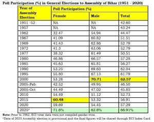 दोनों चरणों को मिलाकर बात करें तो कुल 67.13% मतदान हुआ है। आजादी के बाद से लेकर आज तक बिहार में विधानसभा के चुनाव में कभी इतनी अधिक वोटिंग नहीं हुई थी। चुनाव आयोग द्वारा जारी प्रेस विज्ञप्ति पर भरोसा करें तो दोनों चरणों के औसत मतदान में पुरूषों का मतदान प्रतिशत 62.98 प्रतिशत रहा तो महिलाओं ने 71.78 प्रतिशत वोटिंग कर एक बार फिर से इतिहास रच दिया।